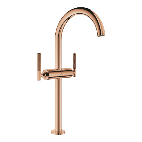 Discover a refuge of grace and elegance with the Atrio Private Collection – the perfect symbiosis of timeless aesthetics, state-of-the-art technology and the highest quality standards, made in Germany. In addition to its delicate design, consisting of clear lines and rounded shapes, this exquisite GROHE SPA series is characterised by its wide range of combinable colours and materials, offering maximum individuality. The particularly hard-wearing and scratch-resistant PVD coating offers optimum protection for the chic Warm Sunset surface. This GROHE Atrio Private Collection 1-hole basin mixer in XL-size also impresses with its inner values. High-quality ceramic components ensure smooth and stepless operation, while water consumption is limited to a sustainable 5 l/min (at 3 bar) – without compromising on performance! With a generous installation height of 420mm, it is perfectly tailored for free-standing basins. This model offers you maximum flexibility thanks to the swivelling spout (150° or 360°), which can also be fixed if required. Thanks to the push-open waste set, the drain valve can be opened and closed with just one finger. Choose from three different lever handles in Warm Sunset for your new mixer tap: 48458DA0 (White Attica Caesarstone), 48459DA0 (Vanilla Noir Caesarstone) and 48646DA0 (knurled structure). GROHE Atrio Private Collection – for a personal touch in the bathroom.