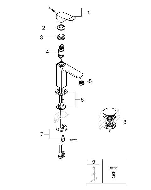 With user comfort in mind, the stylish GROHE Dice single-lever basin mixer combines a crisp cuboid shape with the gentle curve of the tactile metal handle. The medium-sized tap is also super-sustainable, fulfilling all the demands of a modern bathroom. GROHE Water Saving technology limits consumption to an efficient 5l/min (at 3 bar), while still giving a powerful jet of water. Inside, the durable GROHE SilkMove Energy Saving cartridge offers smooth, precise volume and temperature control, and also avoids wasting energy via the cold start function when the lever is in the mid position. An integrated temperature limiter saves even more energy. And the enclosed push-open plug is operated by just a light push of your finger. Surprisingly easy! Designed for single-hole installation – with the help of the QuickTool, QuickGuide and QuickVideo, the tap can be fitted in record time. By the way: our Dice collection can perfectly combined with both round and square taps, showers, accessories and ceramics, to create a harmonious overall design.